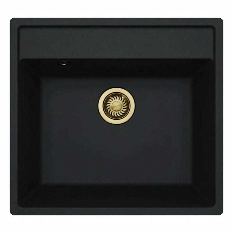 GraniteMy Bremen Granieten Spoelbak 53x50 cm Zwart – Opbouw, Onderbouw en Vlakinbouw met Kraangatbank en Gouden Plug 1208969969